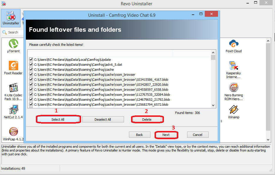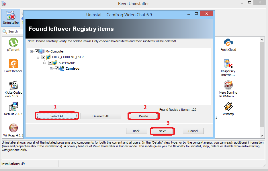 5. Setelah aplikasi sudah terbuang akan tampil lagi kotak dialog uninstaller camfrog. Pilih next>uninstal>next lagi. Sampai disini akan ditemukan sampah registry yang masih ada didalam system windows. pilih select all>delete>next untuk jelasnya lihat gambar dibawah ini.