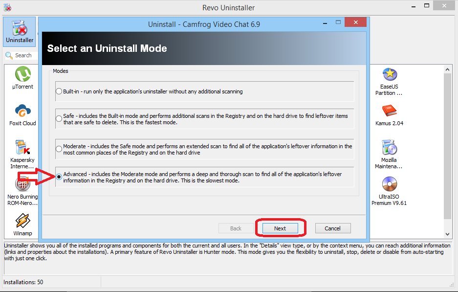 4. Setelah itu akan muncul kotak dialog. Ada empat pilihan, namun saya lebih menyukai pilihan "advance", alasannya sederhana, dengan pilihan advance kita bisa menghapus aplikasi dan juga sampah secara manual. Kalau sudah memilih advance kemudian dilanjutkan dengan klik tombol "Next". Tunggu sebentar, akan muncul uninstal aplikasi camfrog secara otomatis, pilih uninstal dan klik ok.