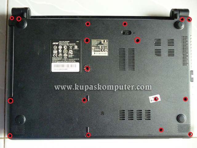 1. Hilangkan terlebih dahulu listrik statis yang ada ditubuh kita karena kita akan membuka bodi atas laptop acer ini. Lepaskan terlebih dahulu baterai laptop sebelum kita melanjutkan ke langkah berikutnya, caranya pun tidak terlalu sulit, saya yakin orang awam pun bisa melepaskan baterai laptop ini.