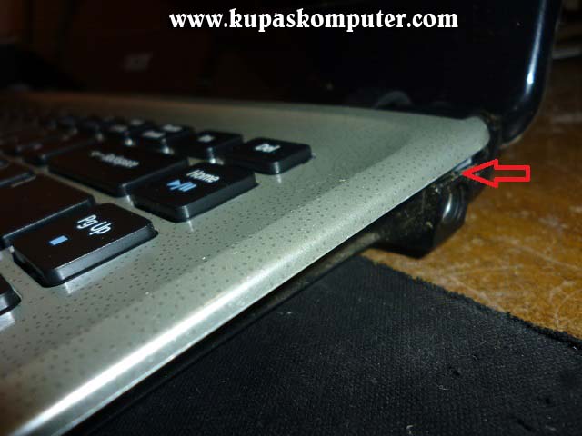 3. Sebelum membuka bodi atas, terlebih dahulu melepaskan optik drive nya (DVD-ROM). Caranya pun tidak terlalu sulit, dengan menarik penutup optik drive tersebut ke arah luar secara perlahan. Posisikan kembali laptop terlebih dahulu seperti biasanya, sekarang kita akan membuka bodi atau penutup atas laptop. Dengan sedikit bantuan kartu ATM tadi, kita masukkan kesela-sela pengunci tutup atas, sambil mengangkatnya secara perlahan. Jangan dipaksakan ya sob, sedikit bersabar adalah kunci utama untuk membongkar laptop.