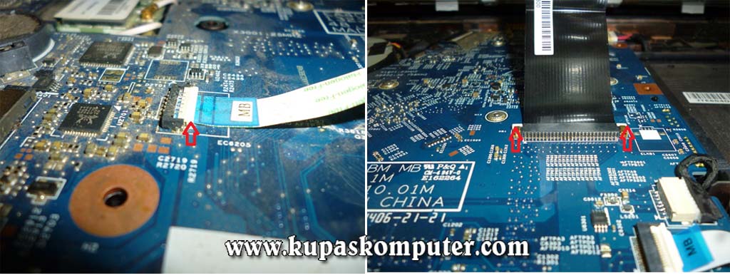 4. Setelah bodi atas terbuka, jangan langsung menariknya keluar karena kita harus terlebih dahulu melepaskan dua konektor yang masih terpasang di area mainboard laptop. Seperti biasanya, cukup dorong pengunci konektor keyboard ke arah luar, kemudian untuk melepas pengunci konektor touchpadnya cukup dorong keatas.