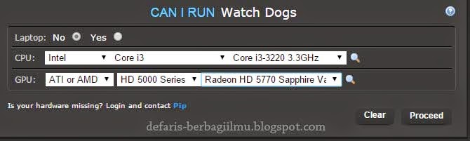 4. Setelah halaman game Watch dogs muncul, masuk kebagian menu CAN I RUN Watch Dogs. Disini ada pilihan laptop : yes/no. Pilih no karena kita menggunakan komputer desktop. Pilih yes, jikalau sobat ingin mengetahui game tersebut bisa jalan di laptop atau tidak. Masukan jenis prosesor dan juga jenis GPU yang kita gunakan. Dilanjutkan dengan klik Proceed. Lebih jelasnya lihat gambar